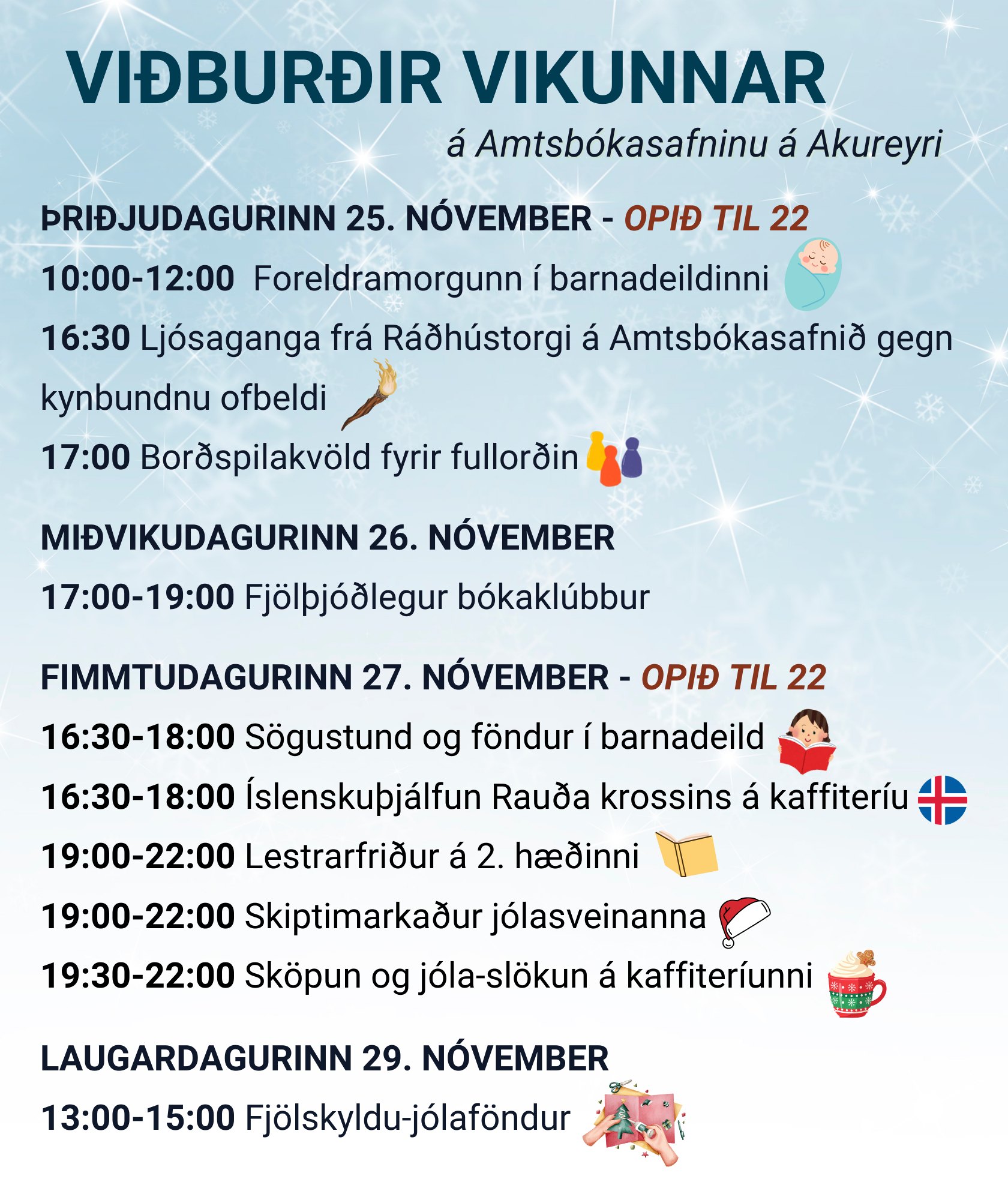 Fjöldi viðburða er í boði á bókasafninu í hverri viku. Nánari upplýsingar eru auglýstar á vef og Facebooksíðu safnsins.