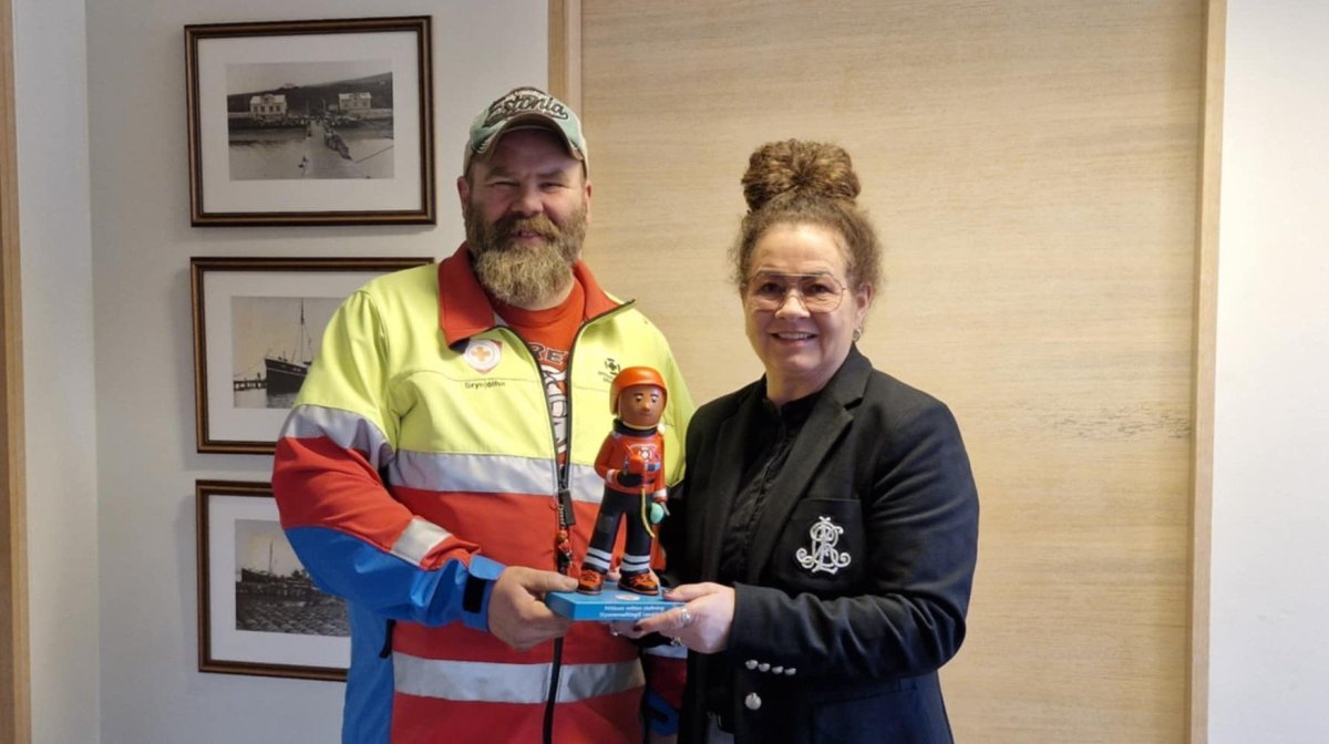 Brynjólfur Snorri Brynjólfsson frá Björgunarsveitinni Tý afhendir Þórunni Sif Harðardóttur sveitarstjóra Neyðarkallinn 2025.